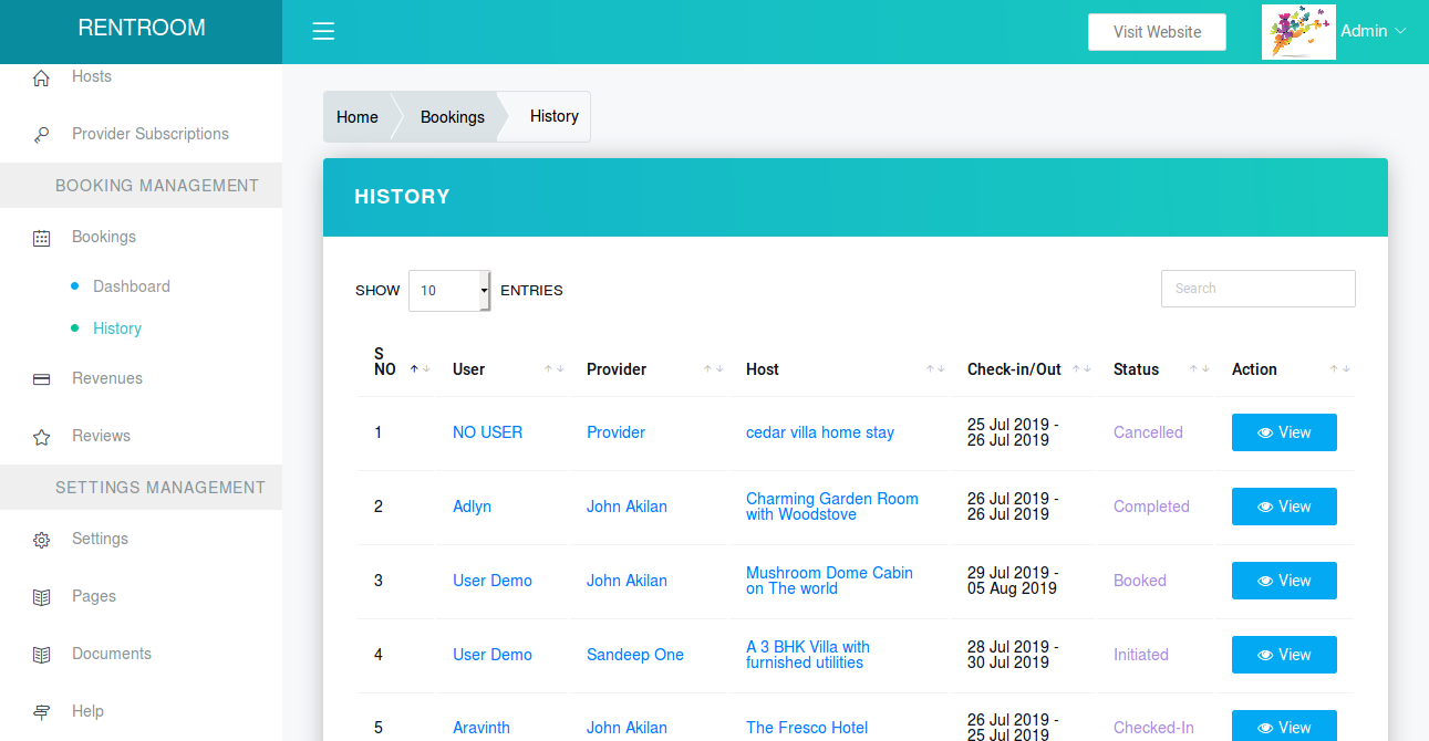 Status - Displays the status of the bookings(Initiated, Completed, Cancelled).
