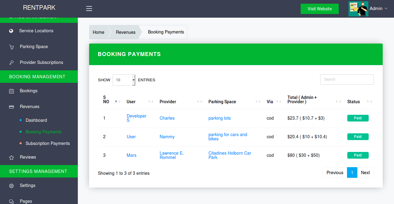 - Admin Panel → Revenues → Booking Payments